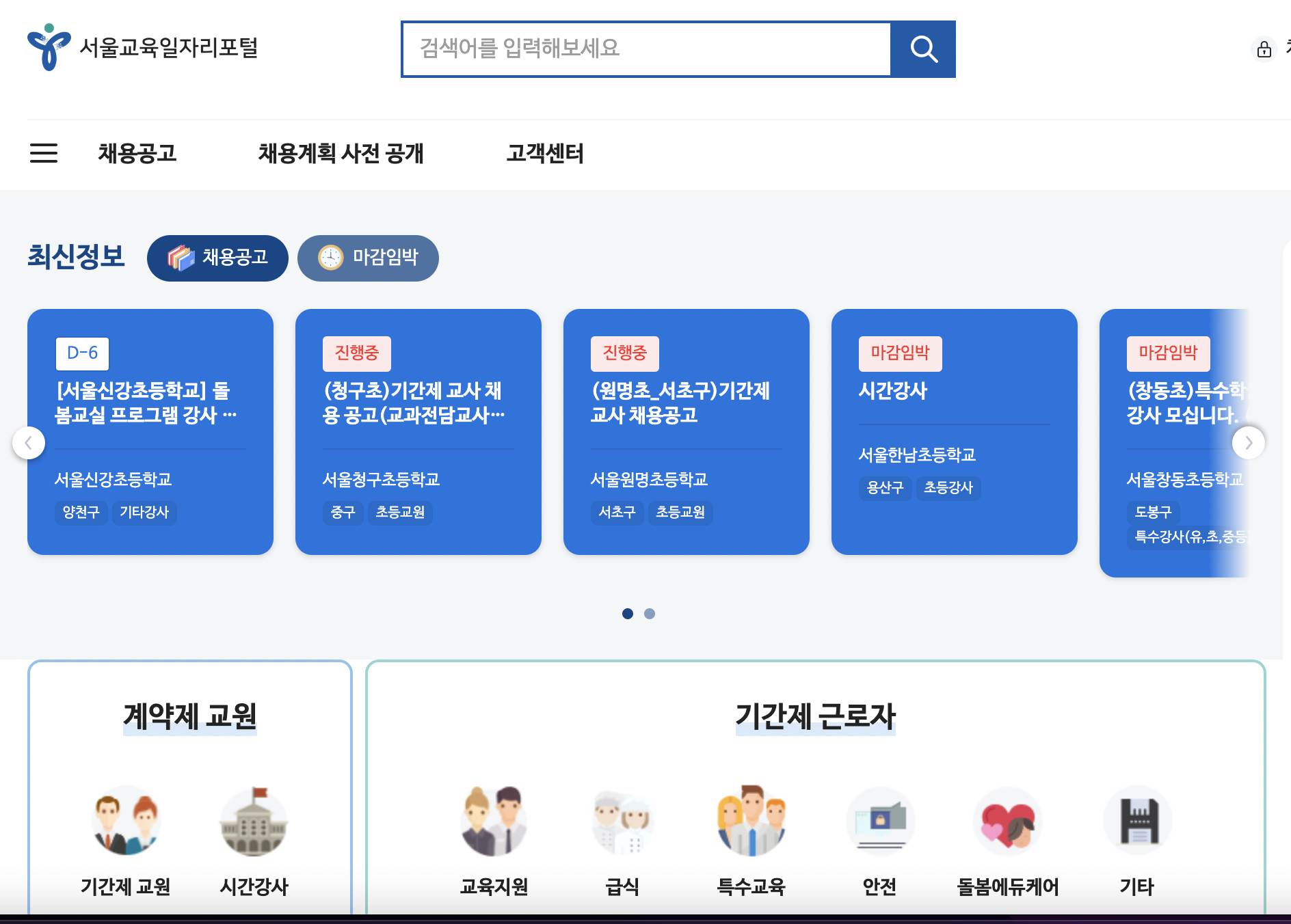 아래 사진은 서울시 교육청 일자리포털 사이트이며 지역별로 채용 공고를 확인하실 수 있습니다. 지원하고자 하는 지역의 근처 학교 홈페이지에서도 공고가 뜰 수 있으니 학교 홈페이지 공지사항도 수시로 체크하시면 좋겠습니다.