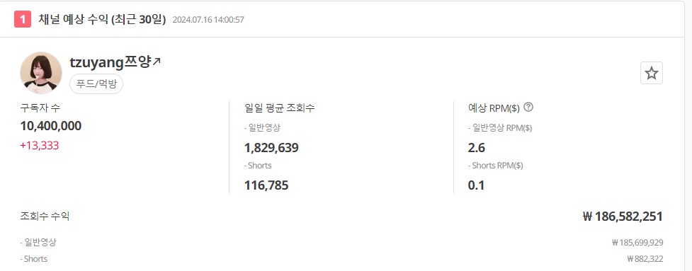 유튜버 쯔양의 수익을 계산해봤을 때 쯔양은 월 1억 8천 정도를 유튜브에서 벌고 있고 기타 광고 수익까지 합치면 월 2억 이상의 수익을 벌고 있을 것으로 예상됩니다.